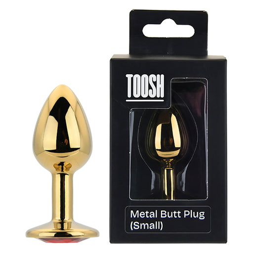Toosh Gold butt plug with red jewel Compatible with oil, silicone, and water-based lubricants Flared base for safety Jewelled base for added aest...