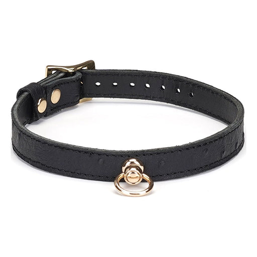 Restrain your partner with this luxurious ostrich skin pattern Liebe Seele Demon's Kiss Black Leather choker with big O-Ring. Shining gold metal l...