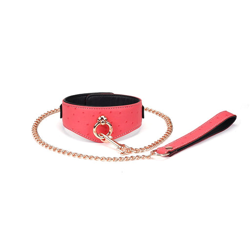 Liebe Seele Angel's Kiss O-Ring choker has an ostrich skin pattern. A perfect combination of pink leather and rose gold metal with a locking 9-hole...