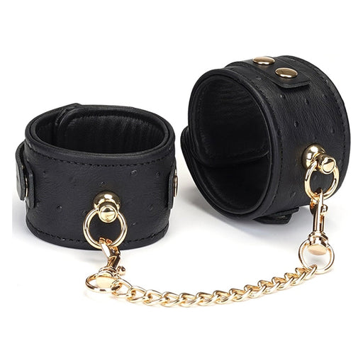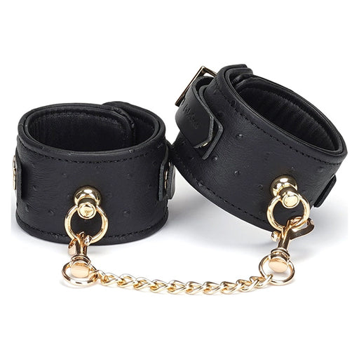 Restrain your partner with these luxurious padded ostrich skin pattern Liebe Seele Demon's Kiss Black Leather wrist cuffs with locking buckles. Sh...