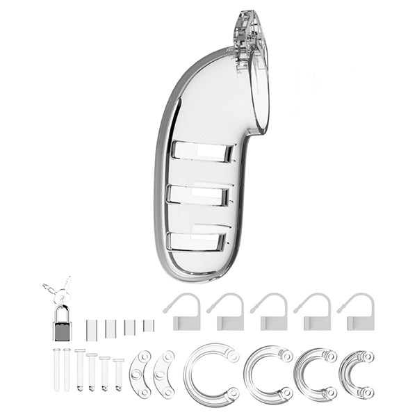 The Man|Cage Model 06 cock cage consists of three parts which fit perfectly together. The two guidance pins connect the top parts and the oval taper pin connects the rings with the cage. A variety of rings in different sizes and distance pieces will allow you to create the perfect size! The rings have a comfortable fit and are absolutely safe. A metal lock or tie-wrap lock can easily close the cage.