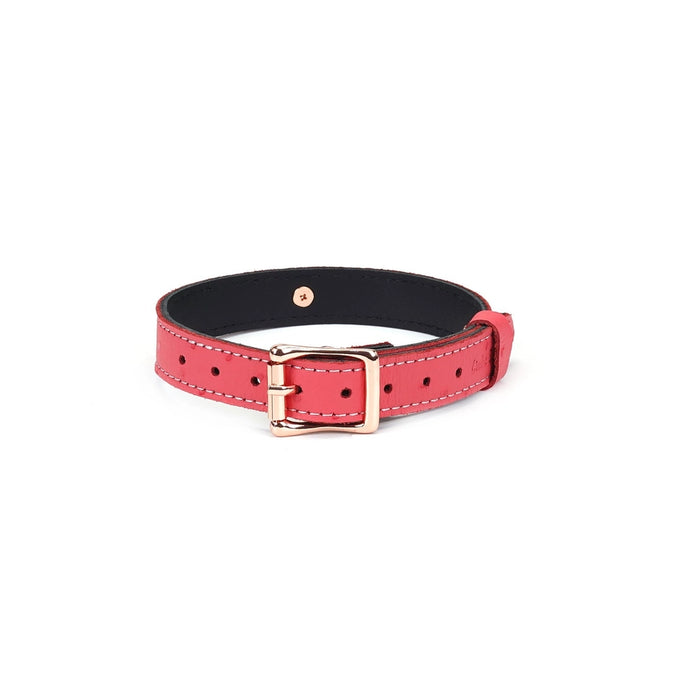 Liebe Seele Angel's Kiss O-Ring choker has an ostrich skin pattern. A perfect combination of pink leather and rose gold metal with a locking 9-hole buckle strap for a perfect fit.