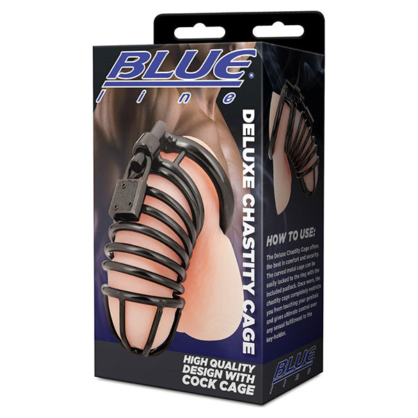 Surround your cock with the cool, hard feel of thick metal rings that wrap around all the way down to the tip. This Blue Line Deluxe cock cage is easy to get into, and firmly keeps your member in place while a second ring secures your testicles.