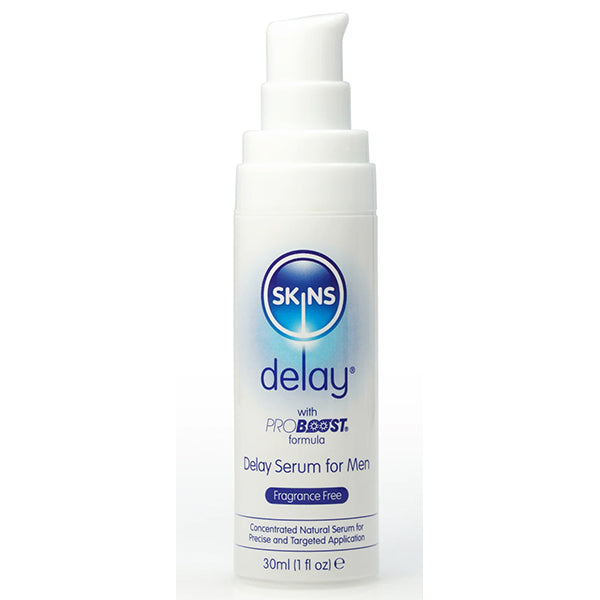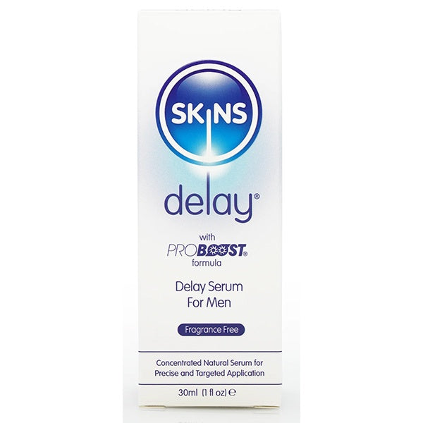Skins Delay® Natural Delay gel serum is an all-natural, discreet, quick and easy solution to one of the world’s biggest sexual wellness concerns. Made from a unique PROBOOST® formula with natural ingredients including L'Arginine, Panax Ginseng, Gingko Biloba, Maca Root, Saw Palmetto and Catuaba Bark.