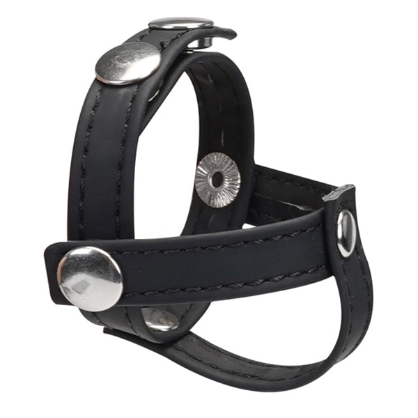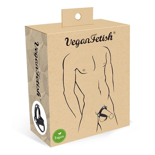 This Vegan Fetish cock ring has a T-style ball splitter for fans of restrictive stimulation. The main ring is fully adjustable via press studs.